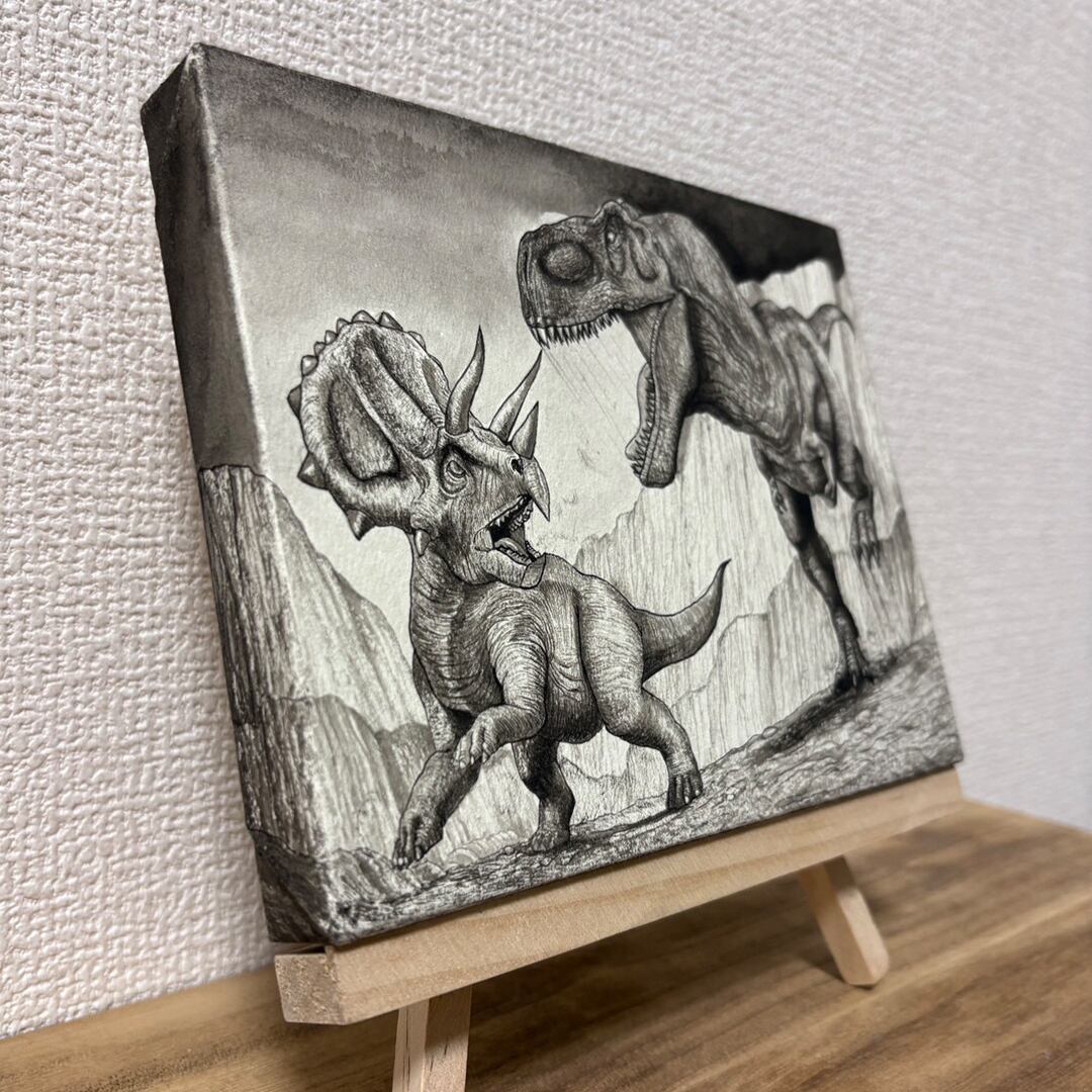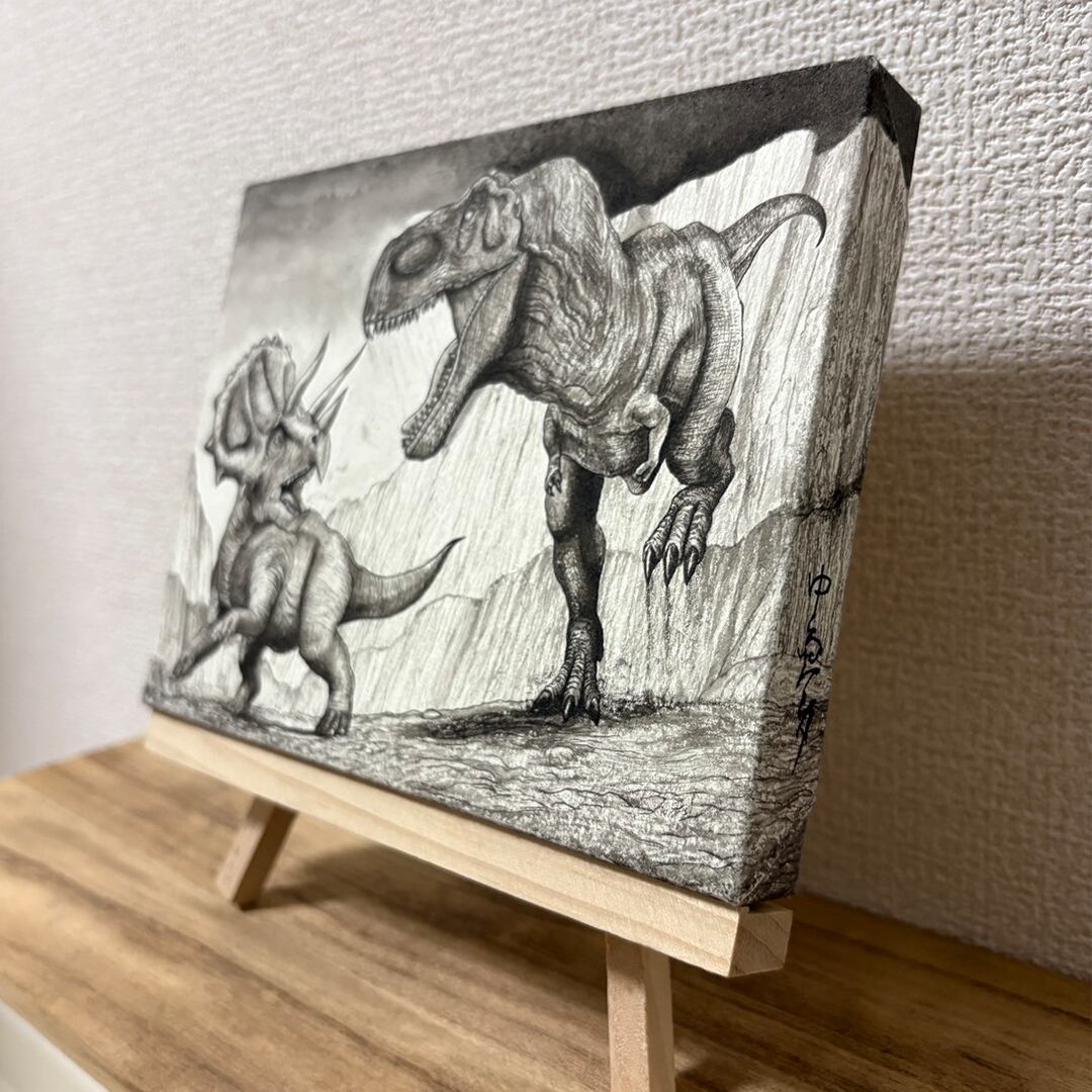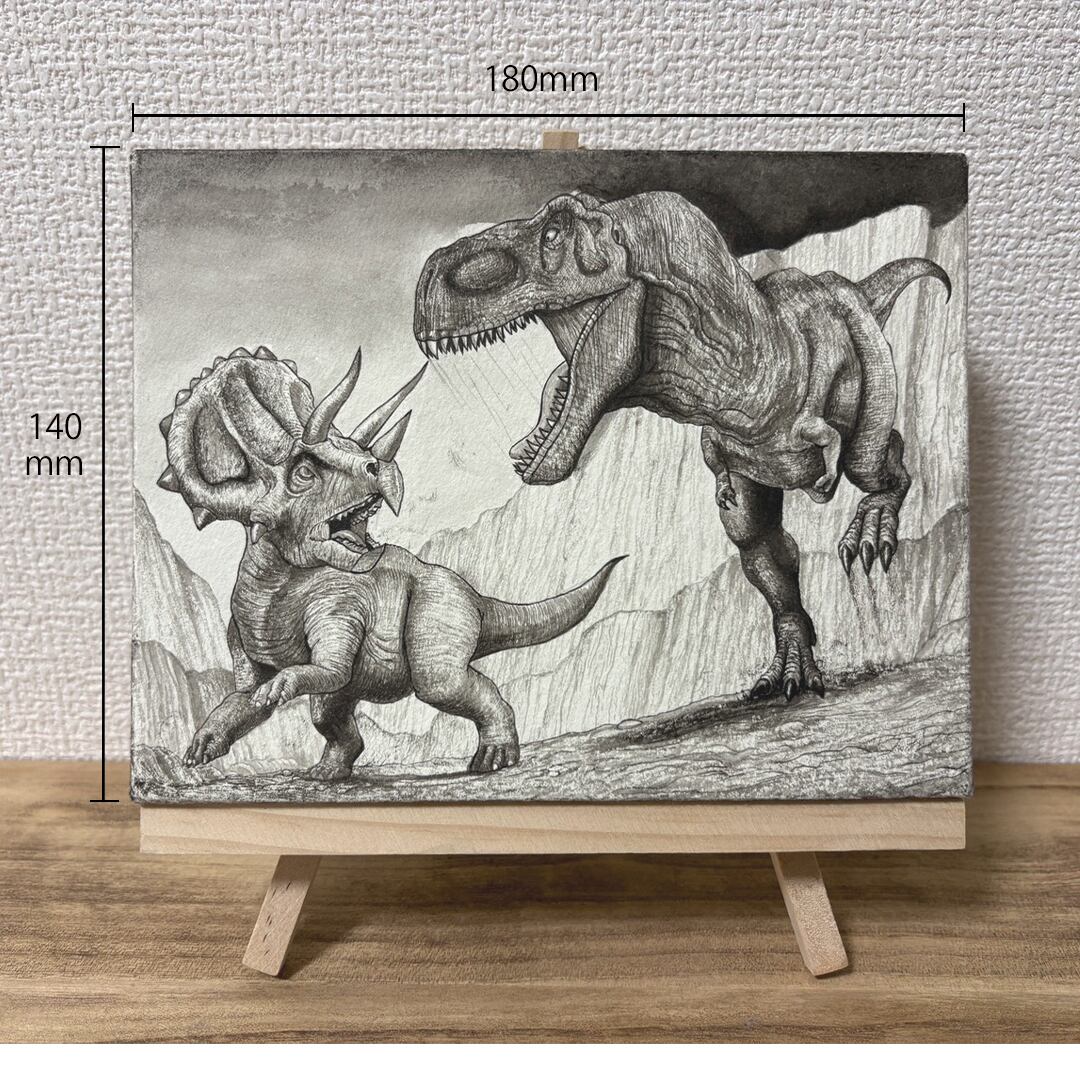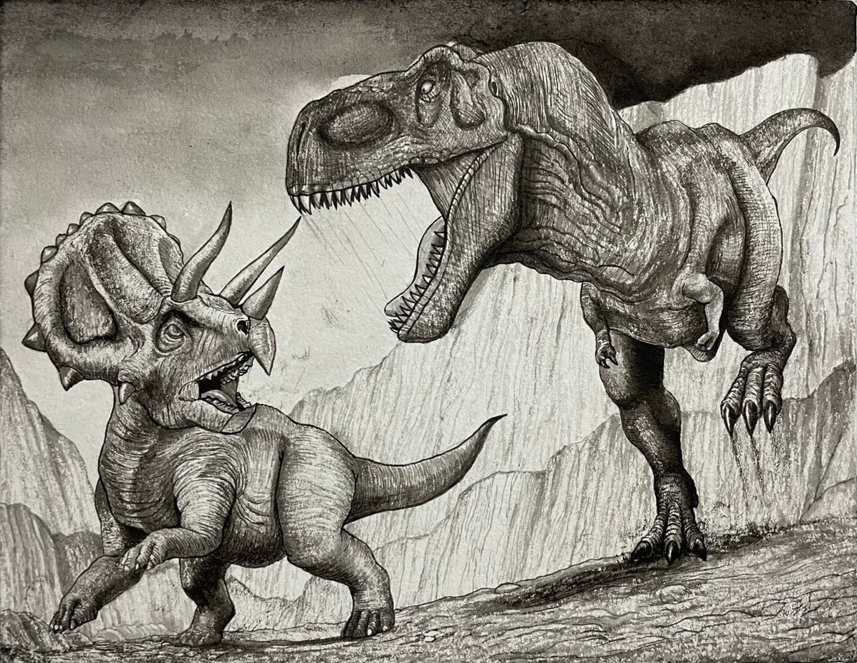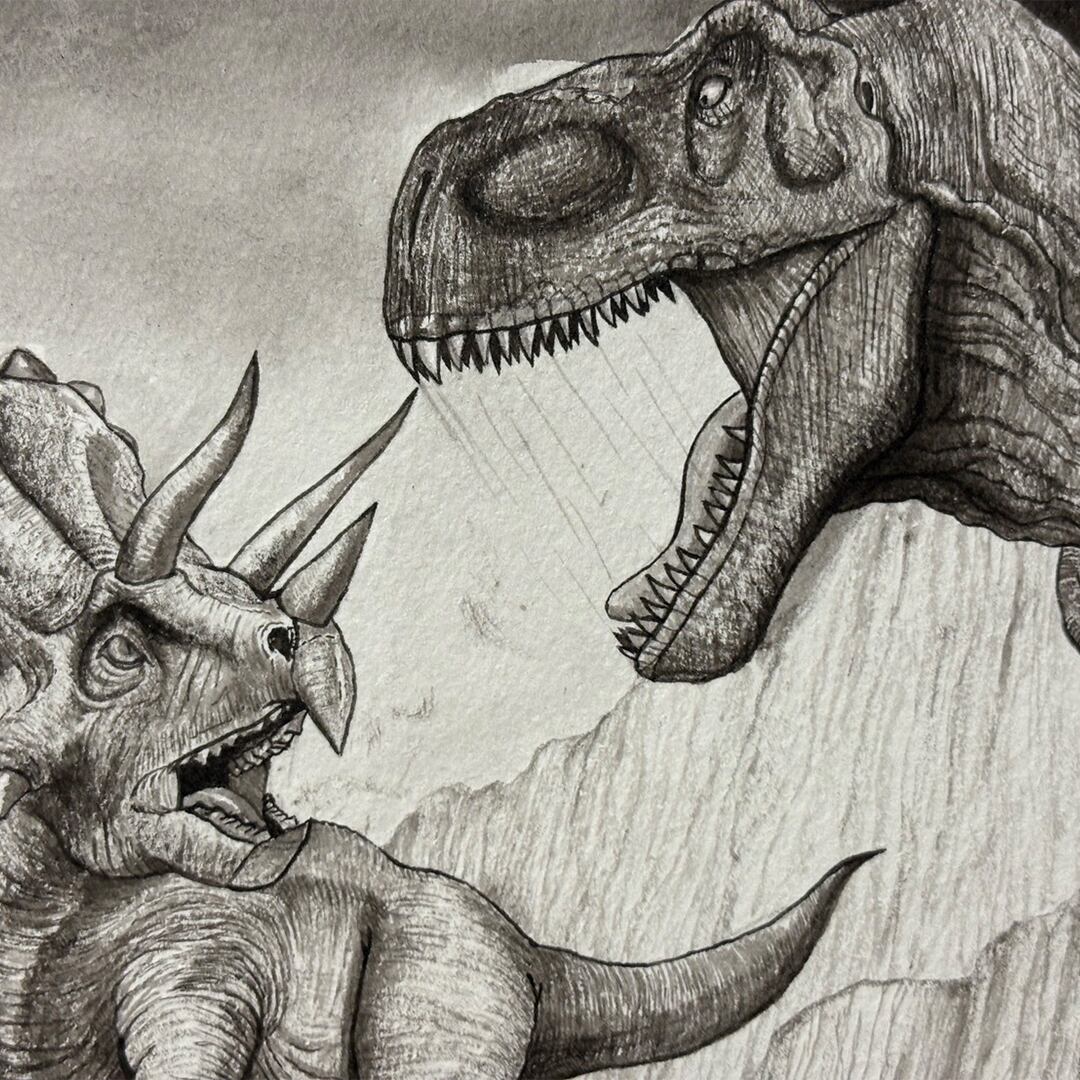 岩壁に追い詰めるティラノサウルスに対し、戦う覚悟を決めて向き直るトリケラトプスを描きました。