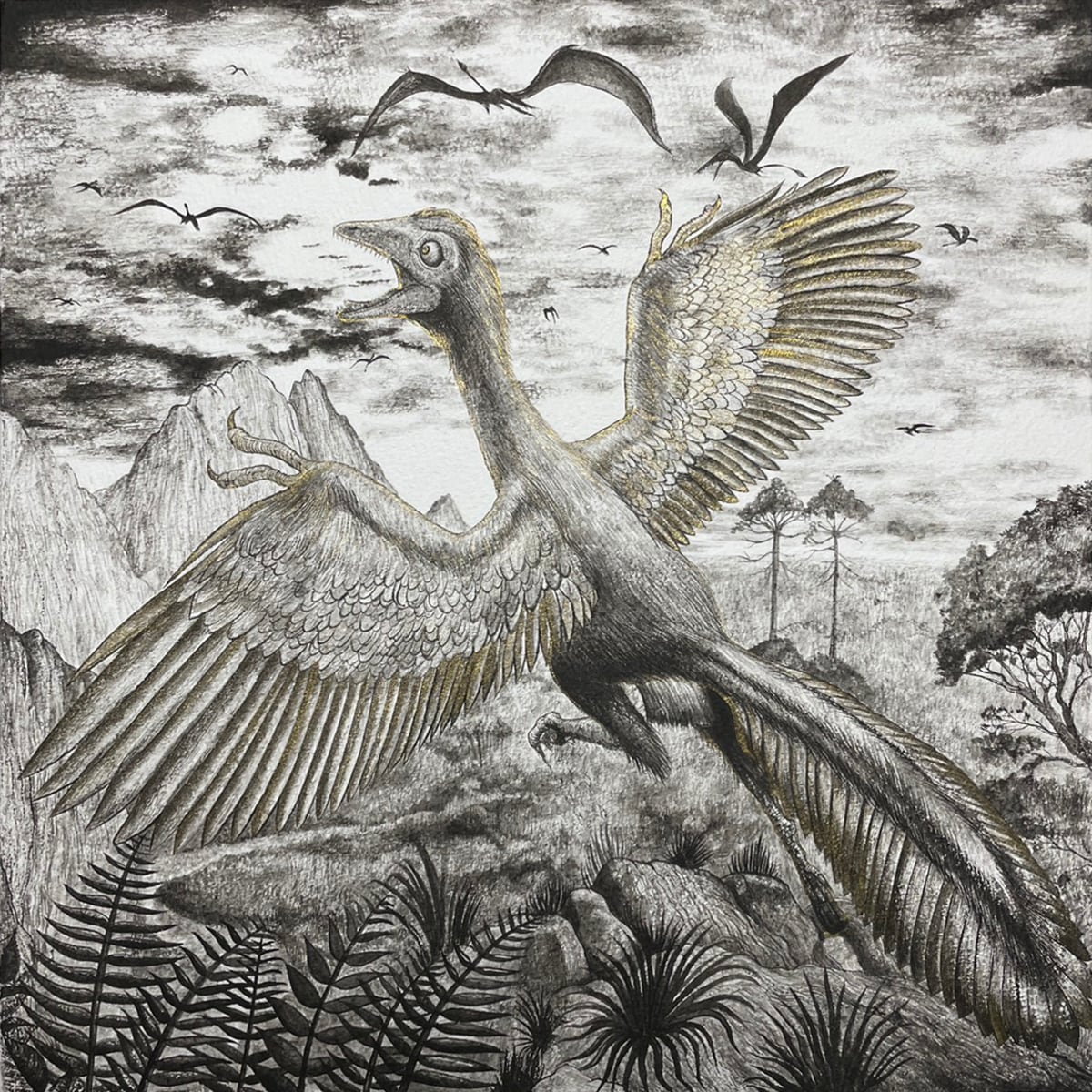 アーケオプテリクス(始祖鳥)が挑む様子を描きました。