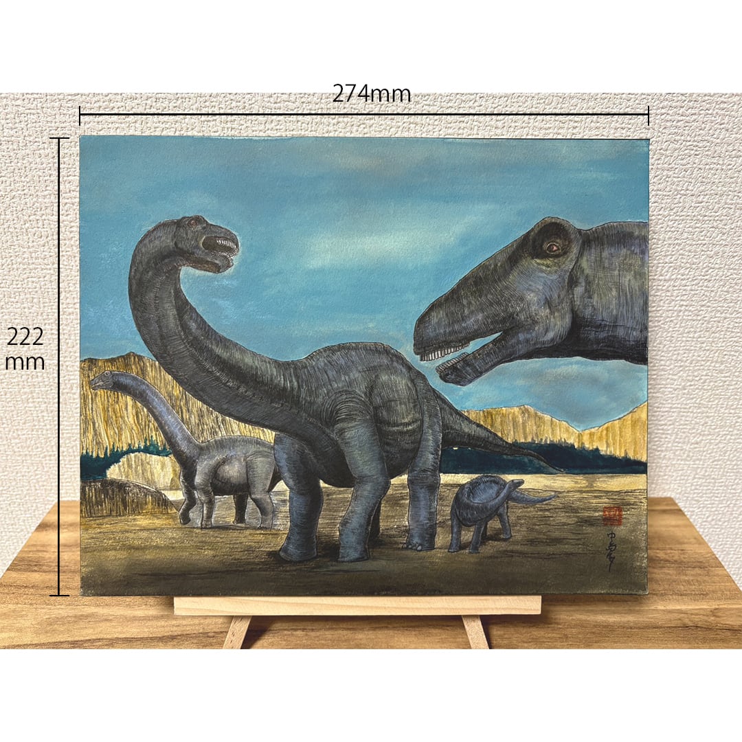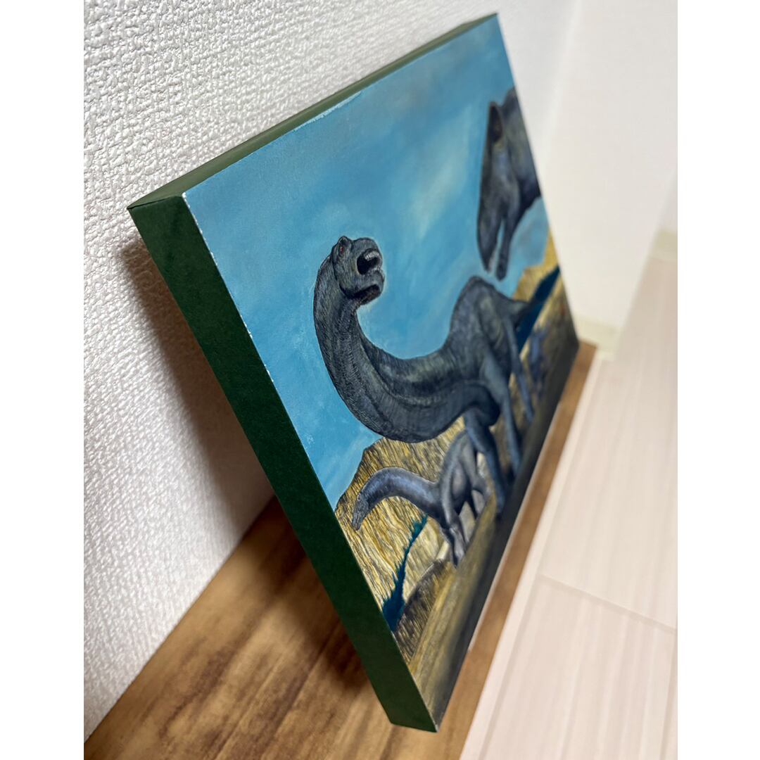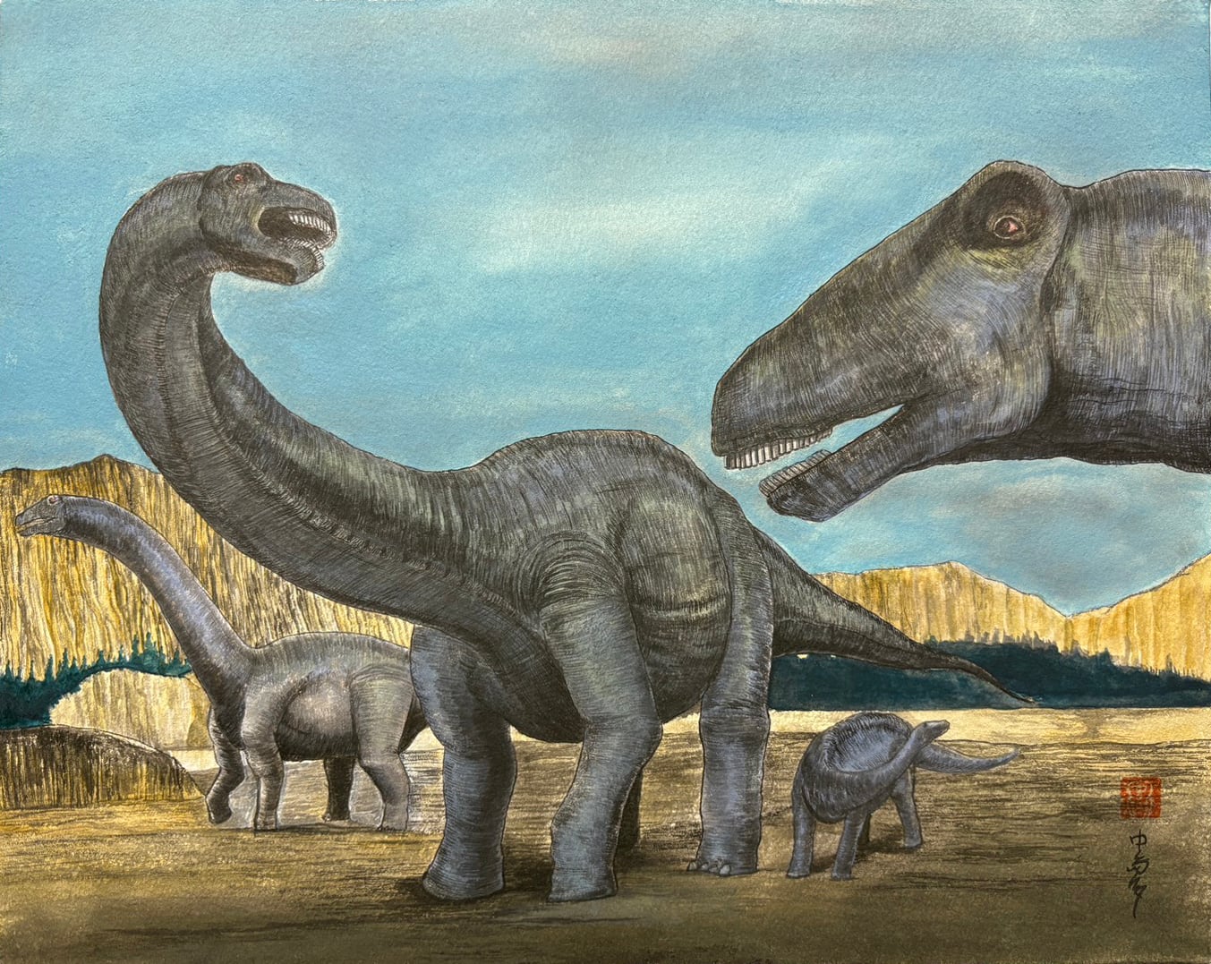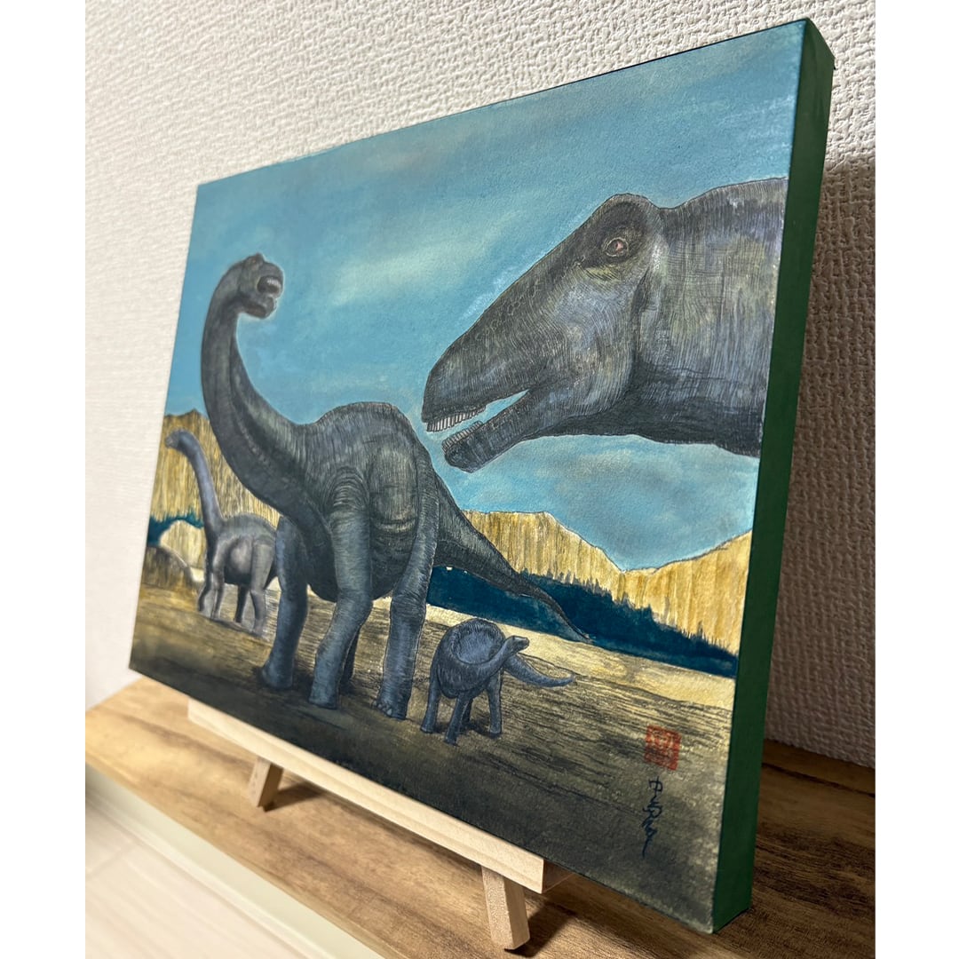 大地を闊歩するアパトサウルスのファミリーが雄大な自然の中で描かれています。この作品は、古代の大地を感じながら、広大な青空の下、家族の絆や生命の営みを表現しています。