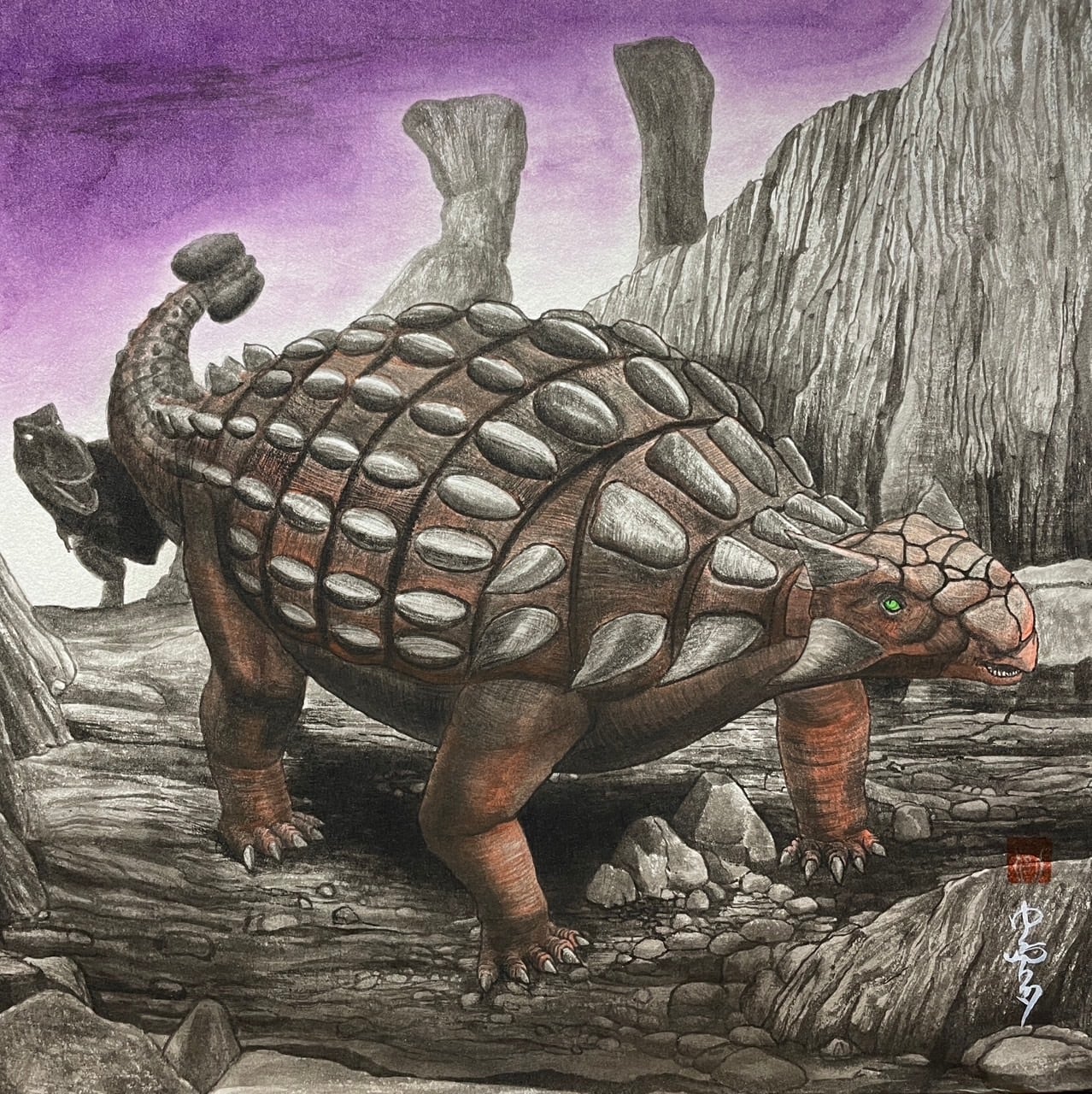 T-rexに付け狙われ、戦慄するアンキロサウルスの姿を描きました。