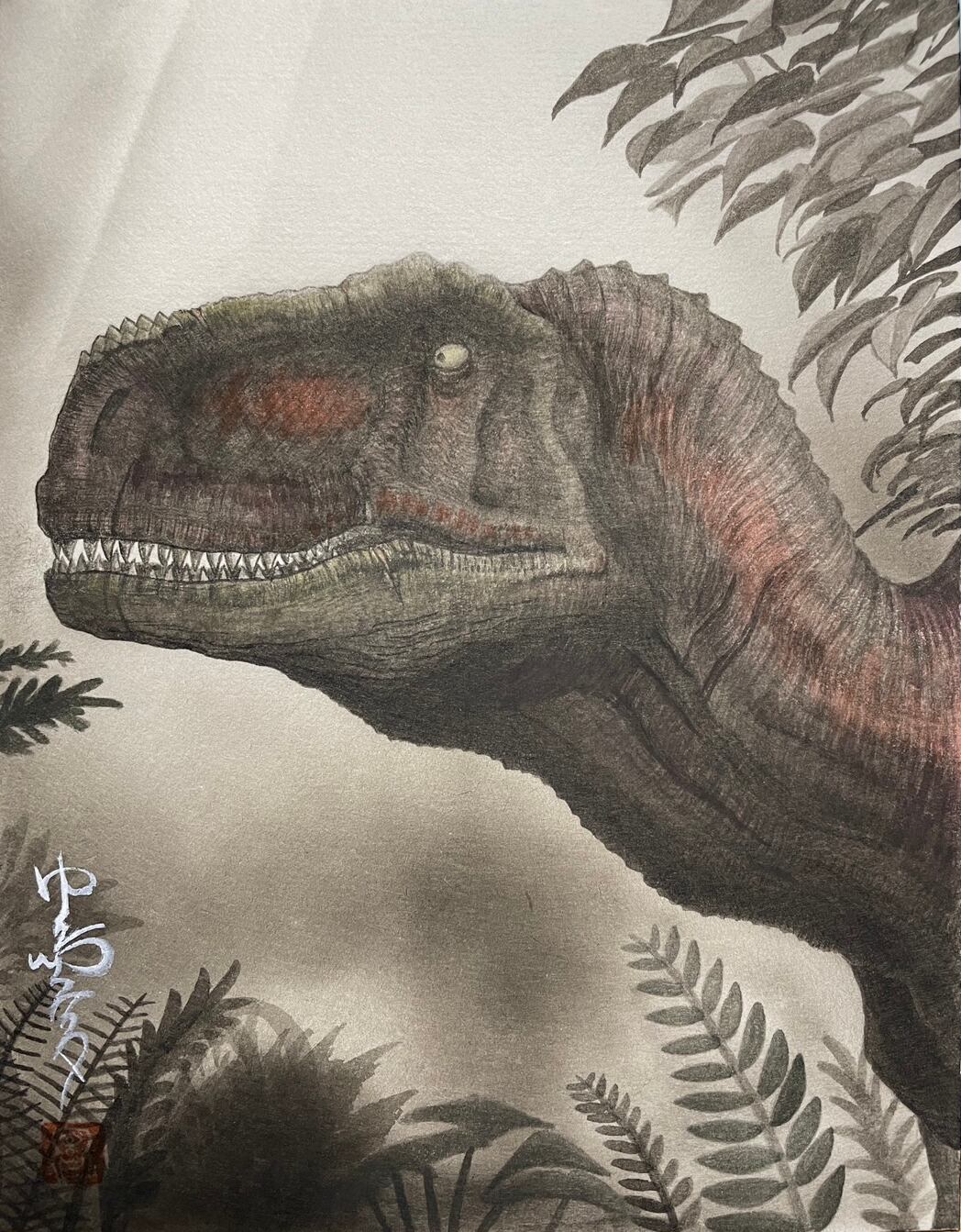 薄暗い茂みから顔を覗かせるアベリサウルスを描きました。