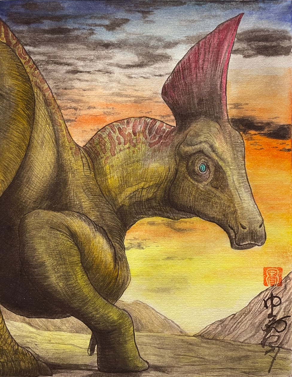日が沈む最中夕闇に照らされた オロロティタンが、こちらに振り返るように視線を向ける。
