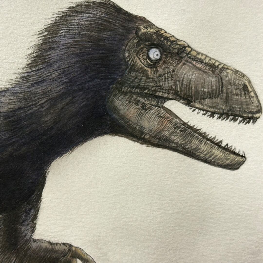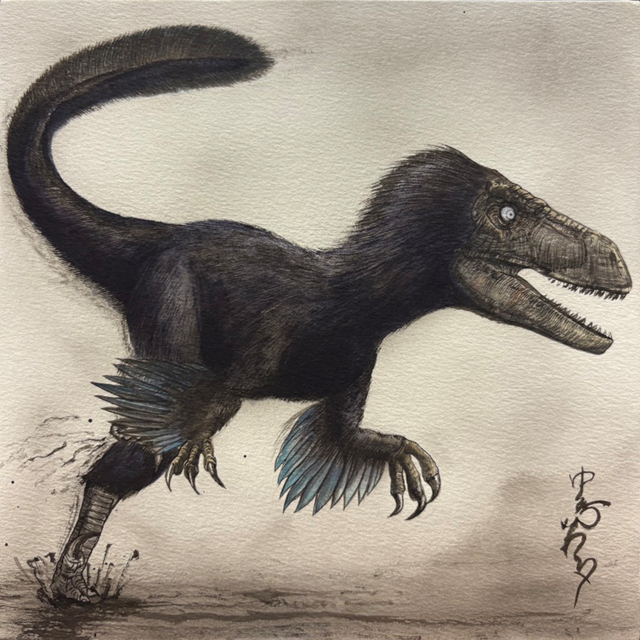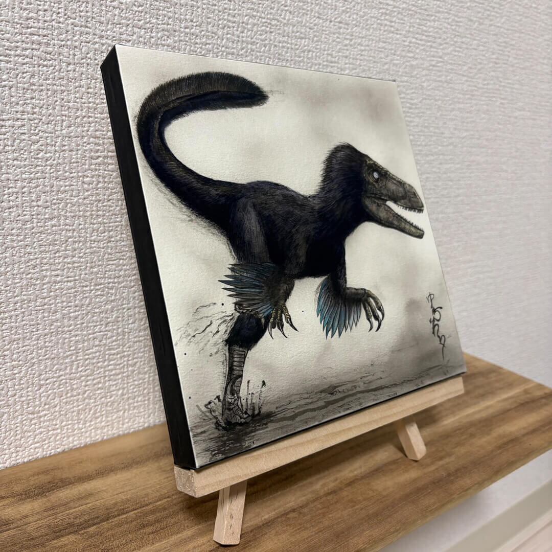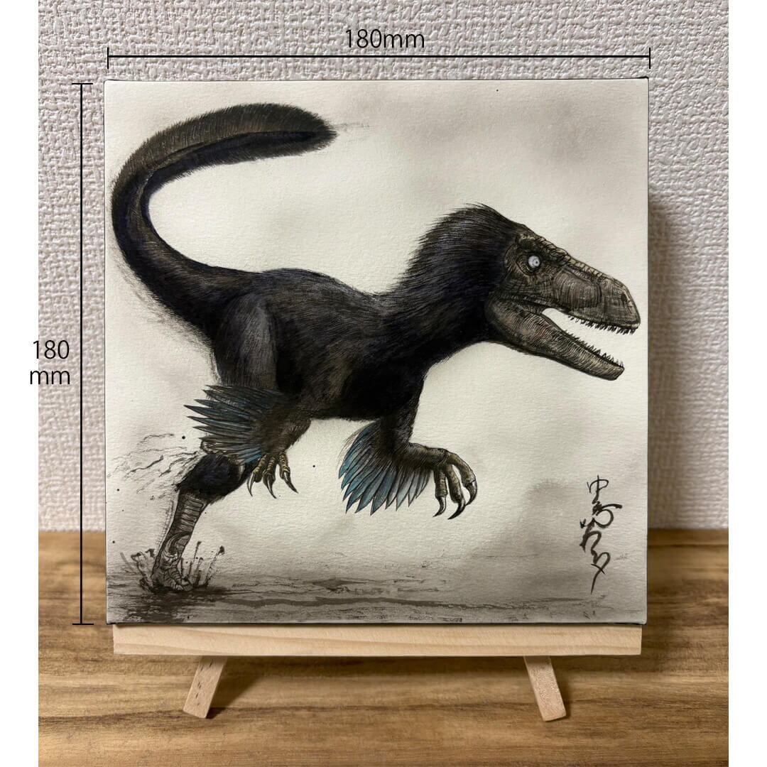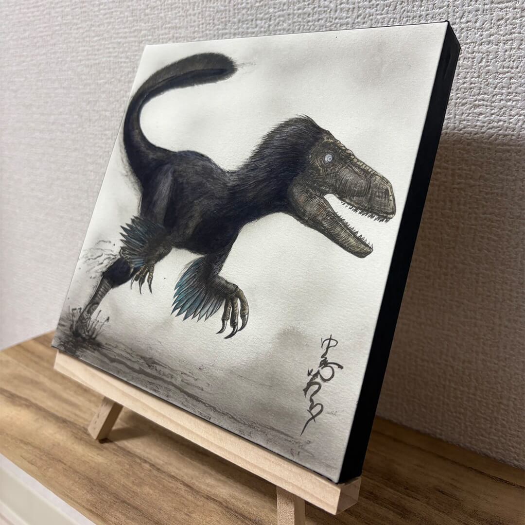 砂塵を颯爽と走り抜けるデイノニクス。力強さと俊敏さを兼ね備えたこの恐竜が描かれています。大自然の中で自由に駆け抜ける姿は、その表情からも力強い生命力を感じさせます。