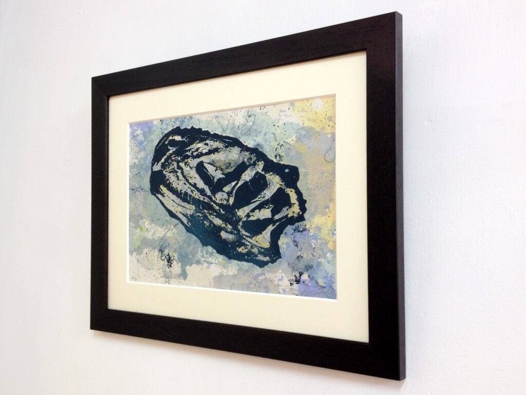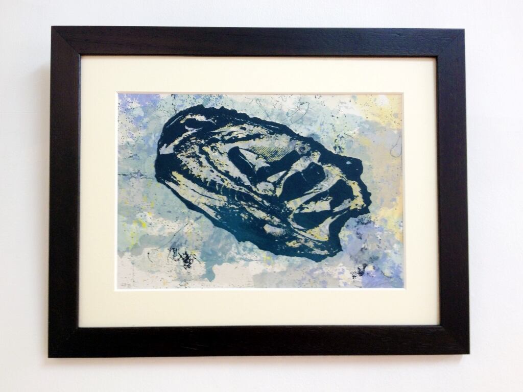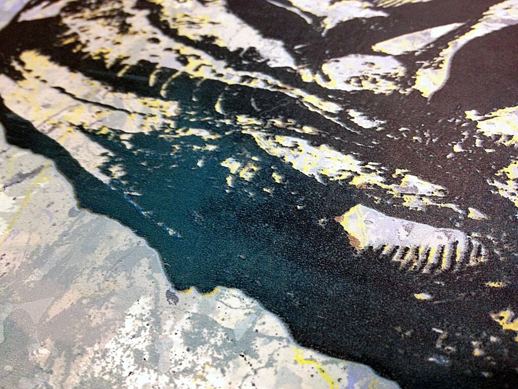 インクの染みの描画を何色も重ね、恐竜の化石を写真製版で刷ったシルクスクリーンの作品です。